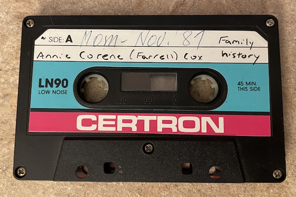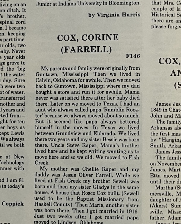 Parts of the audio sounds very similar to an entry for "Cox, Corine[sp] (Farrell) F146" published in the 1989 book "Haskell County History Indian Territory - 1988" by the Haskell County Historical Society. The book cites it's taken directly from an audio tape that Corene gave to the Historical Society. This lines up with the tape I have being from 1987 and this published in 1988/1989. However several of the names/places/details in that entry do not match up with the audio I have, plus there is some details in the book that aren't in this recording and vice versa. I don't know if this tape was the same source material for the book, or if she just used the same notes and information for both.